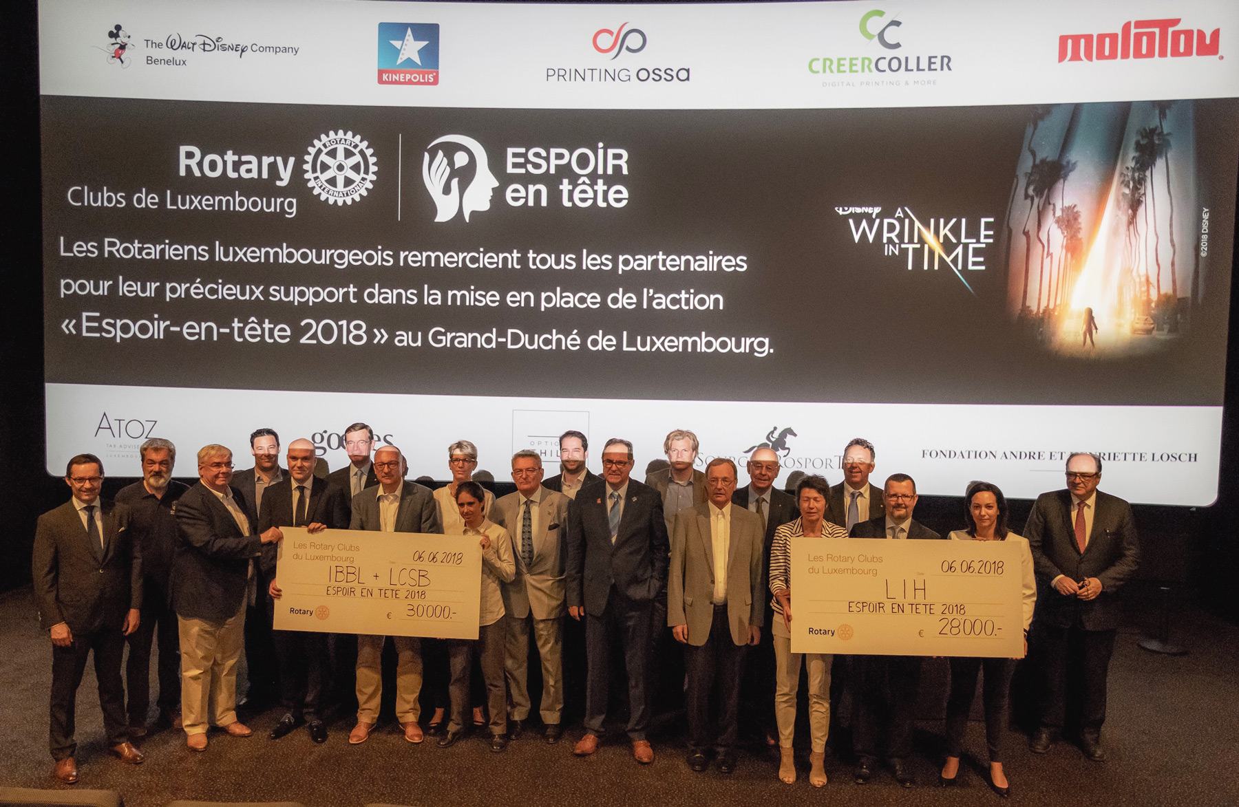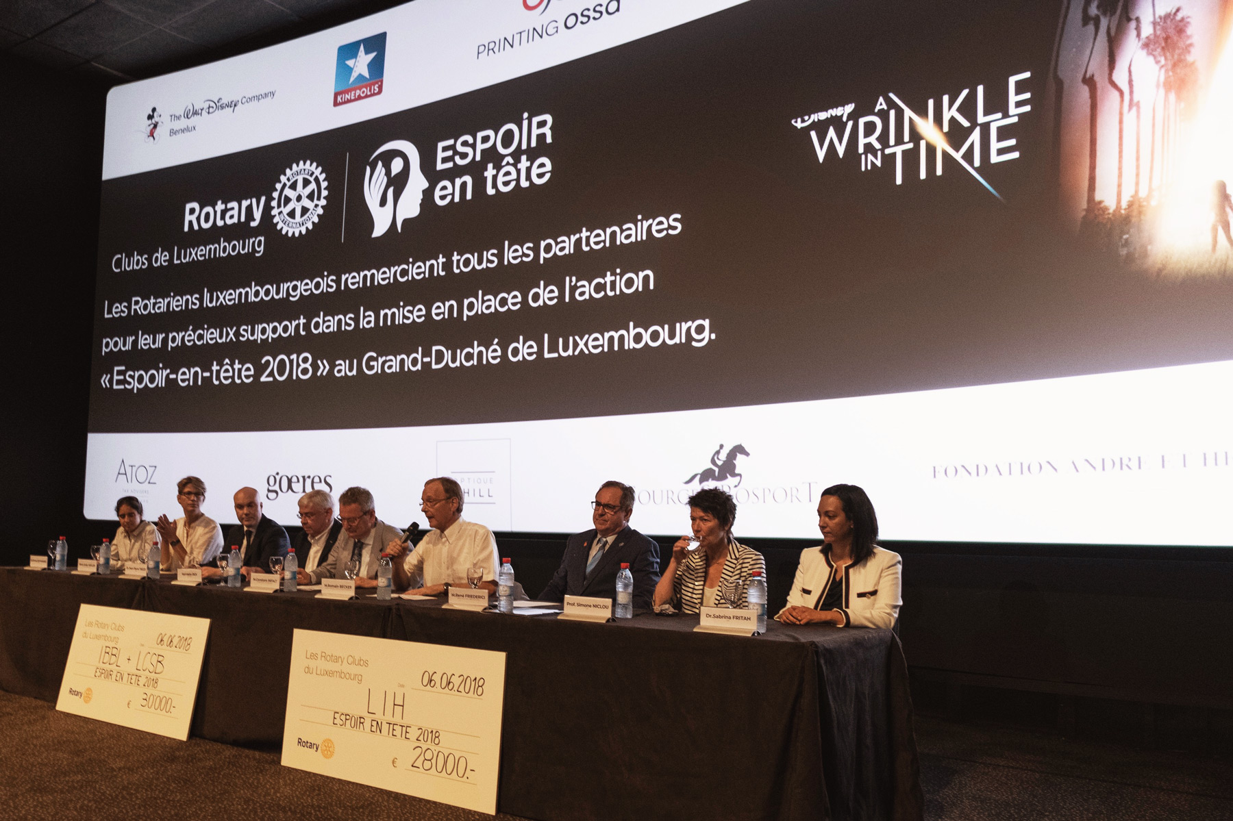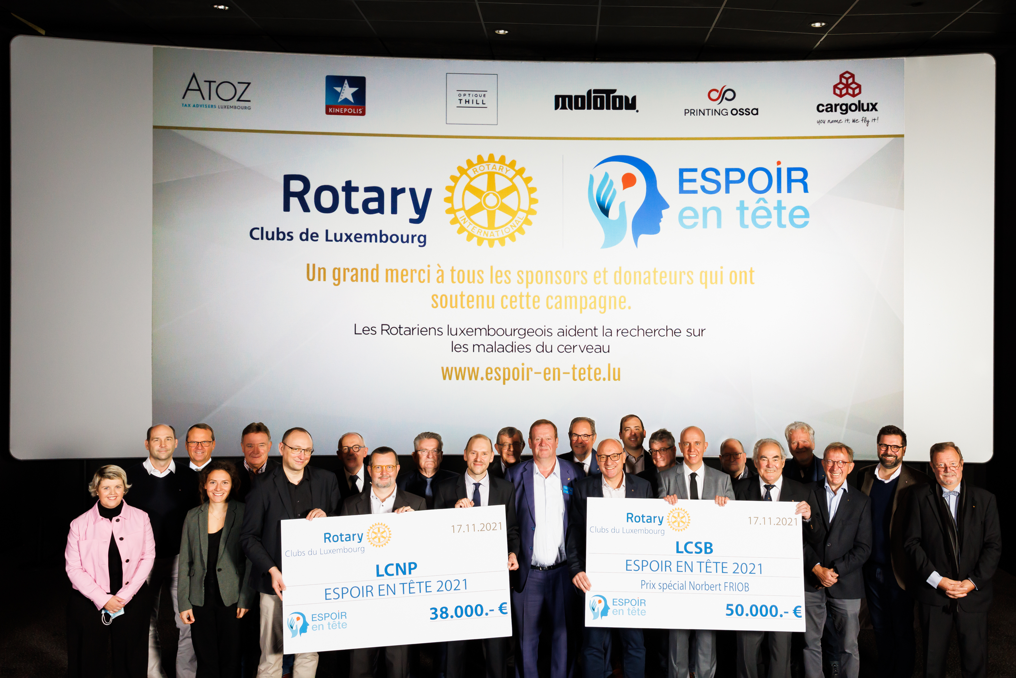 Organisée pour la 8e année consécutive, l’action Espoir en tête, initiée par les Rotary Clubs luxembourgeois, a permis de récolter 50 000 euros de dons en faveur de la recherche sur les maladies du cerveau au Luxembourg. L’action Espoir en tête permet chaque année de récolter des dons via l’organisation d’avant-premières et de projections d’exception dans les cinémas Kinepolis du Kirchberg et de Belval.